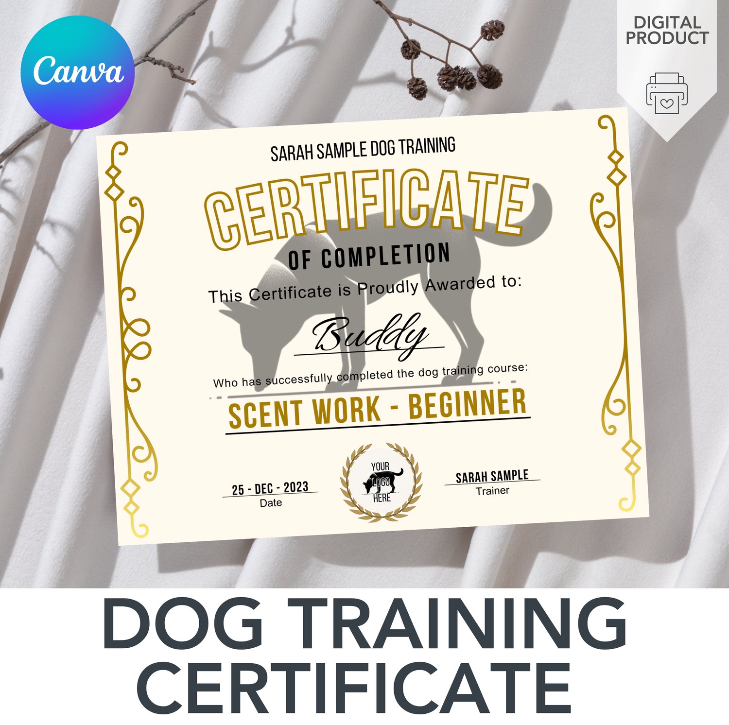 Dog Training Certificate – Editable Canva Template (Digital Product)