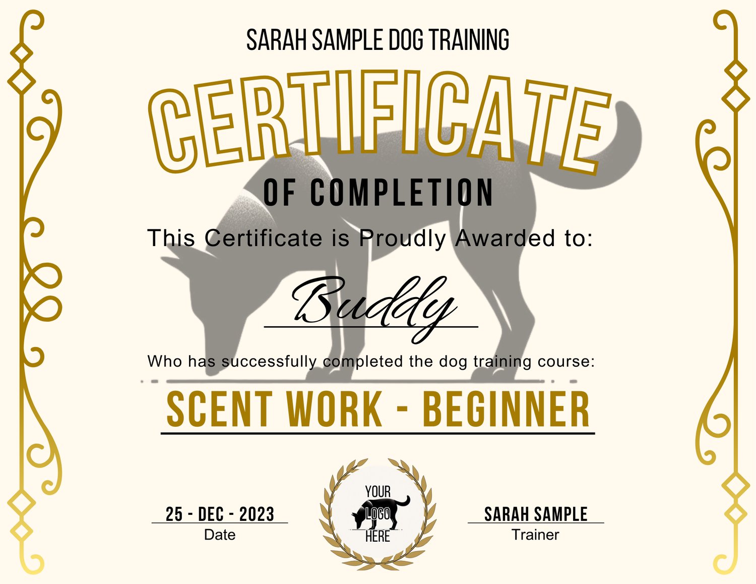 This editable Dog Training Certificate template is the perfect way to recognize your clients’ progress and reward their dogs’ achievements — whether for scent work, obedience, puppy classes, or sport training.