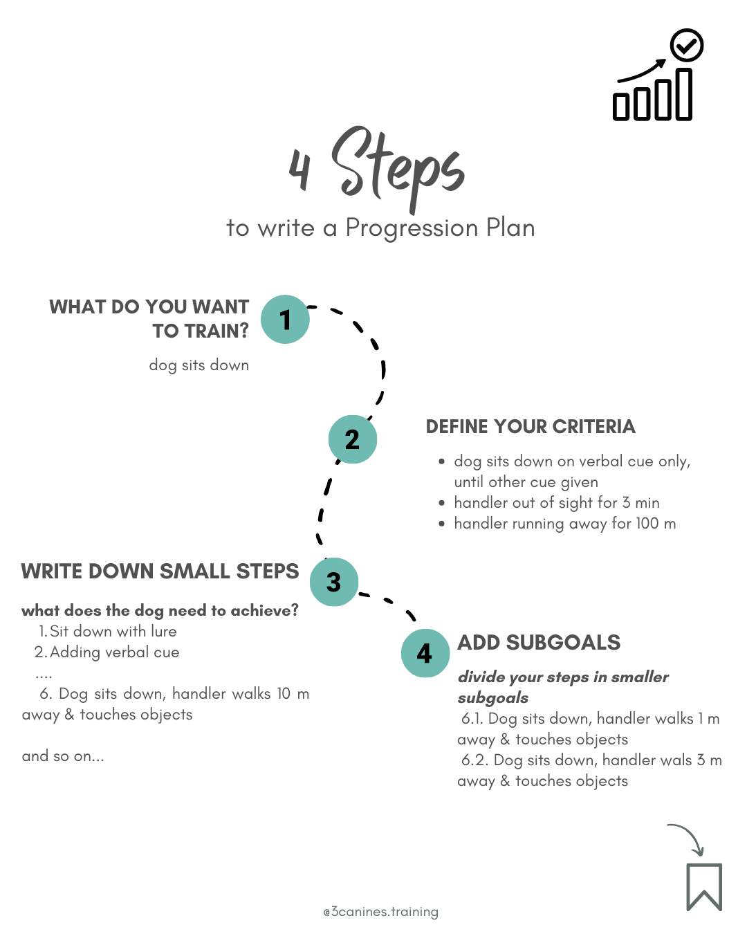 Once you’ve set your criteria you can start writing your progression plan for this behavior. While training stick to the criteria you have set up in your training steps consistently. If the dog does not meet the standard, reset and start again.